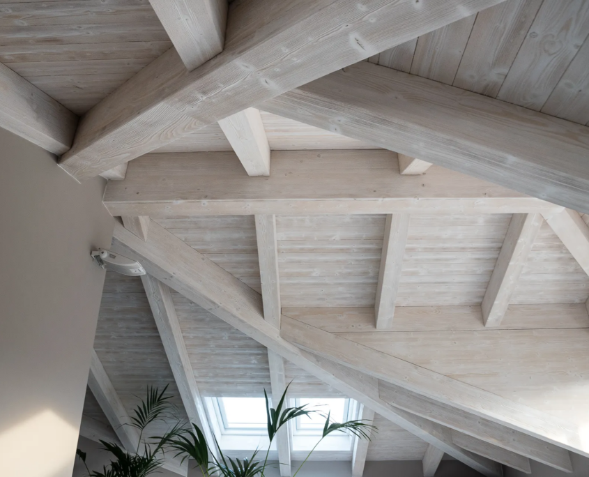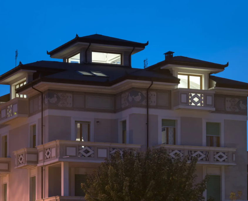 L’intervento ha reso abitabile il nuovo piano, ottenendo altezze adeguate e mantenendo equilibrio con le proporzioni del fabbricato esistente. Il tetto in legno lamellare e gli abbaini riprendono il disegno originario, mentre il rinnovamento delle facciate conferisce coerenza ed eleganza all’insieme.