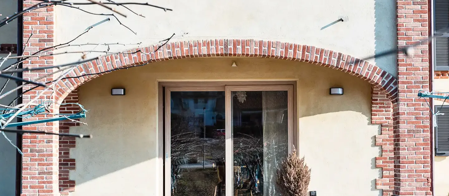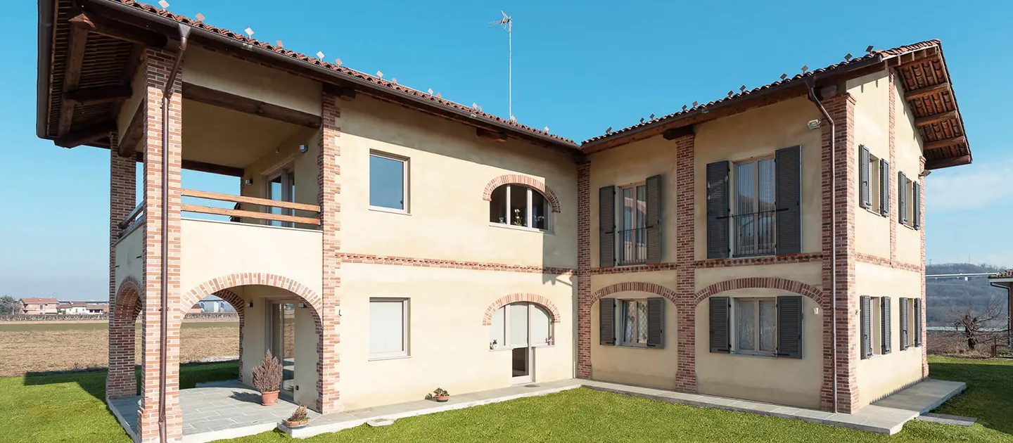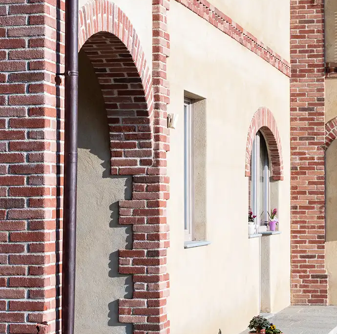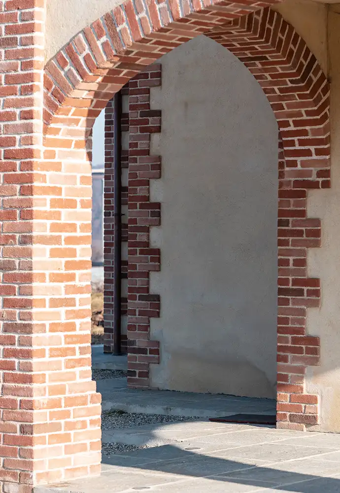 I materiali scelti raccontano la tradizione rurale locale, con intonaci, archi e lesene in mattoni a vista. Il tetto in legno massiccio con coppi antichi e la cura dei dettagli garantiscono comfort abitativo e un dialogo coerente con il paesaggio circostante.