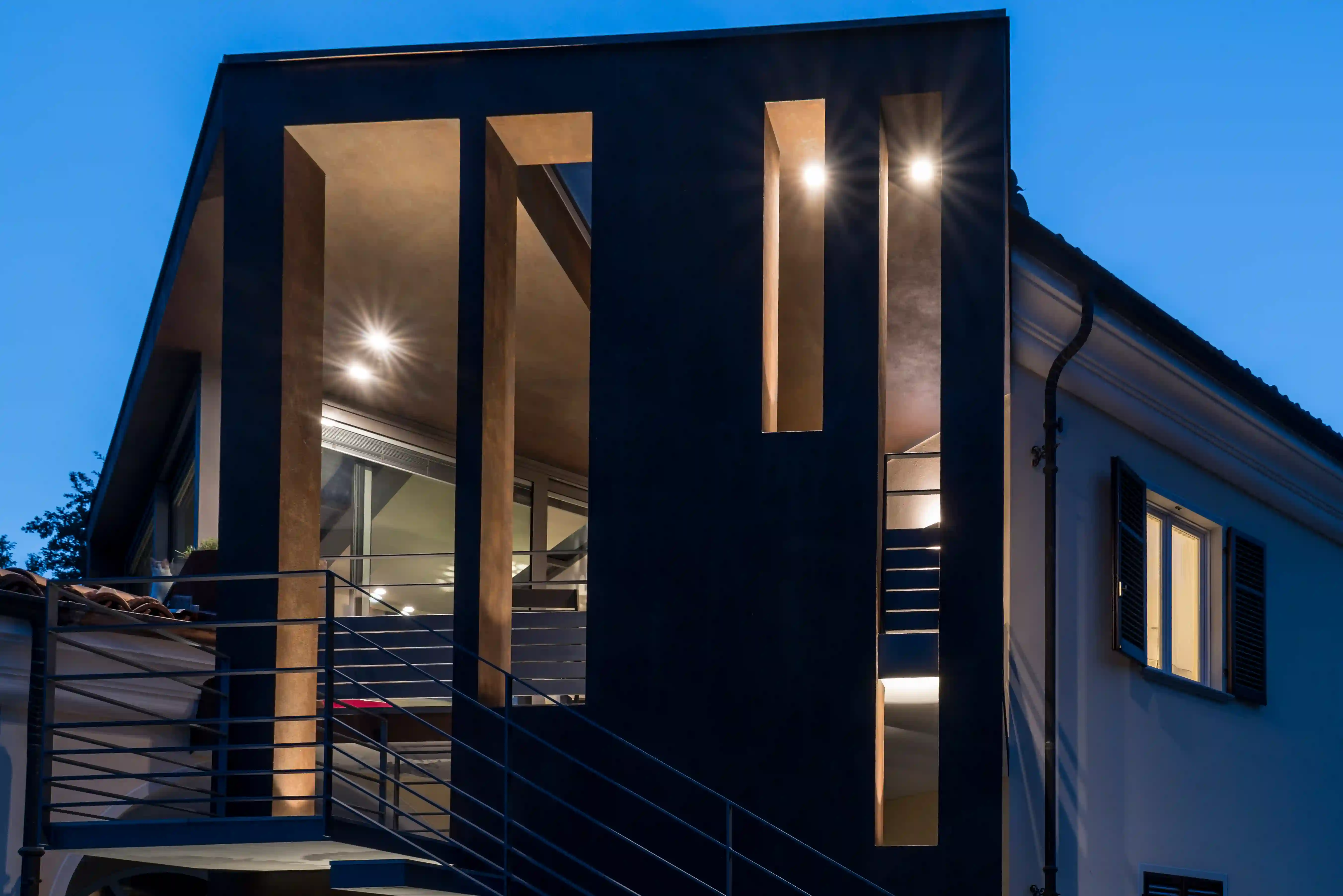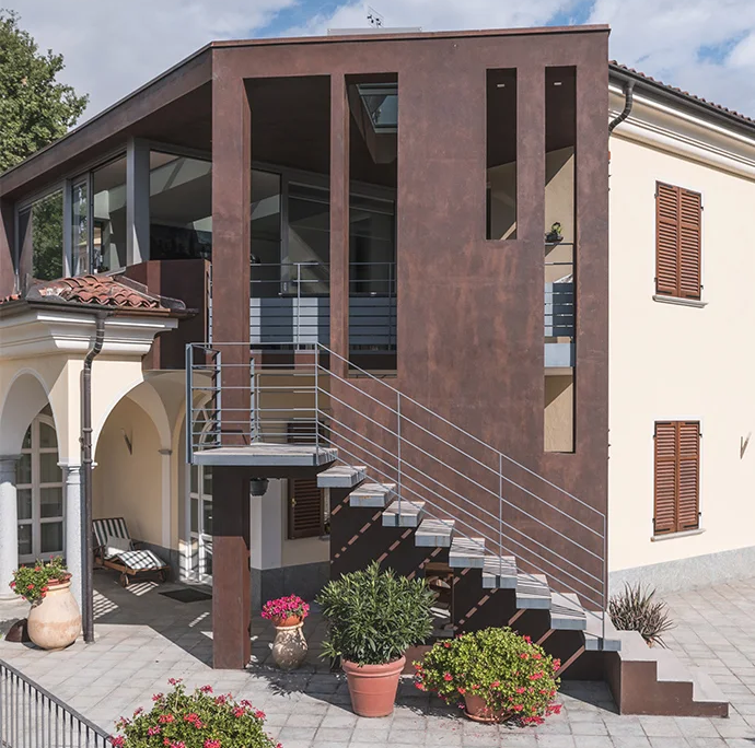 L’ampliamento di questa villa nasce dal dialogo tra esistente e contemporaneo, attraverso l’inserimento di un nuovo volume progettato con materiali e strutture moderne. L’intervento ha rispettato l’aspetto originario dell’edificio, introducendo soluzioni innovative come il rivestimento in ferro cor-ten.