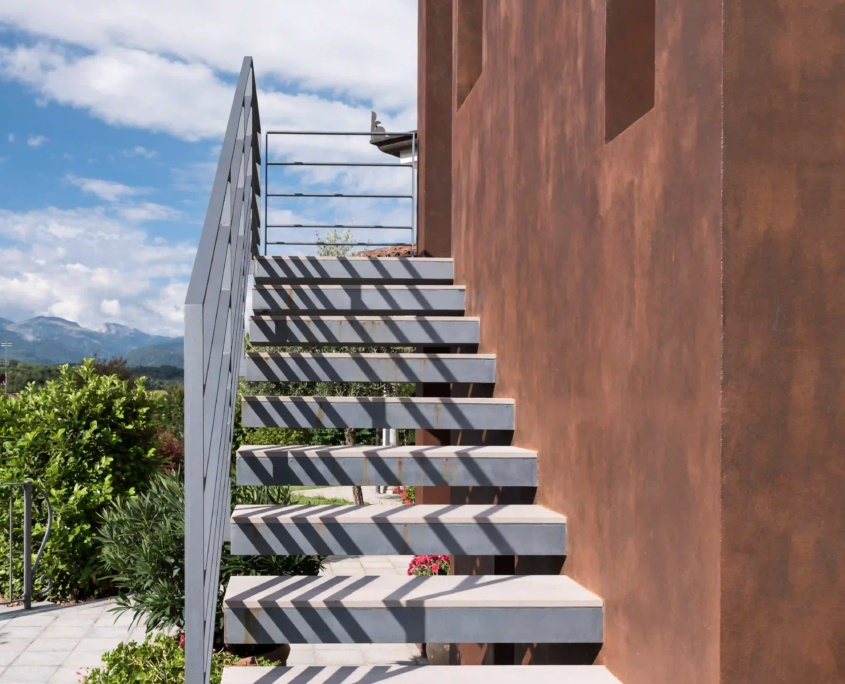 Il nuovo volume si integra con l’edificio esistente grazie a una struttura indipendente in ferro, che consente l’inserimento di ampie aperture zenitali. La continuità tra interno ed esterno e l’uso del ferro cor-ten conferiscono un linguaggio contemporaneo, mantenendo equilibrio e rispetto per l’identità storica della villa.