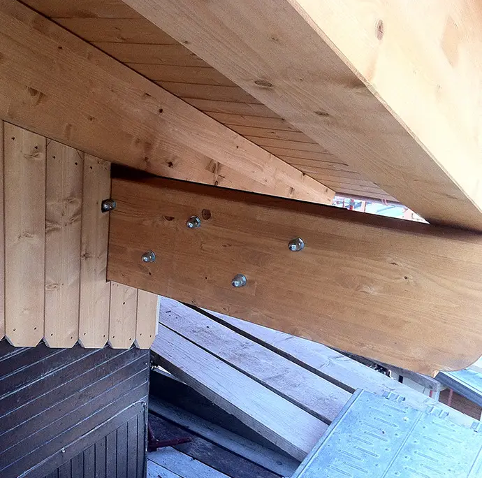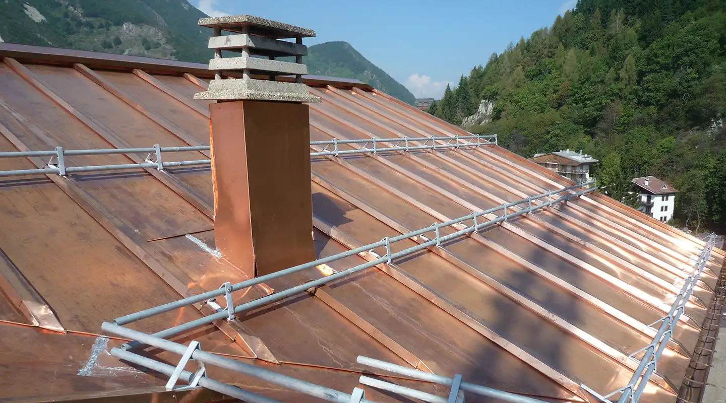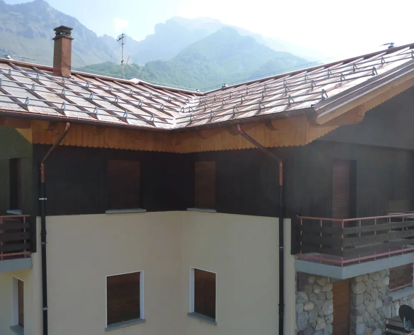 La nuova stratigrafia di copertura comprende un pacchetto isolante in fibra di legno abbinato a una posa del rame alla francese, soluzione adatta al contesto montano. L’intervento ha restituito qualità all’edificio, rispondendo in modo equilibrato sia alle esigenze funzionali sia a quelle estetiche del condominio.