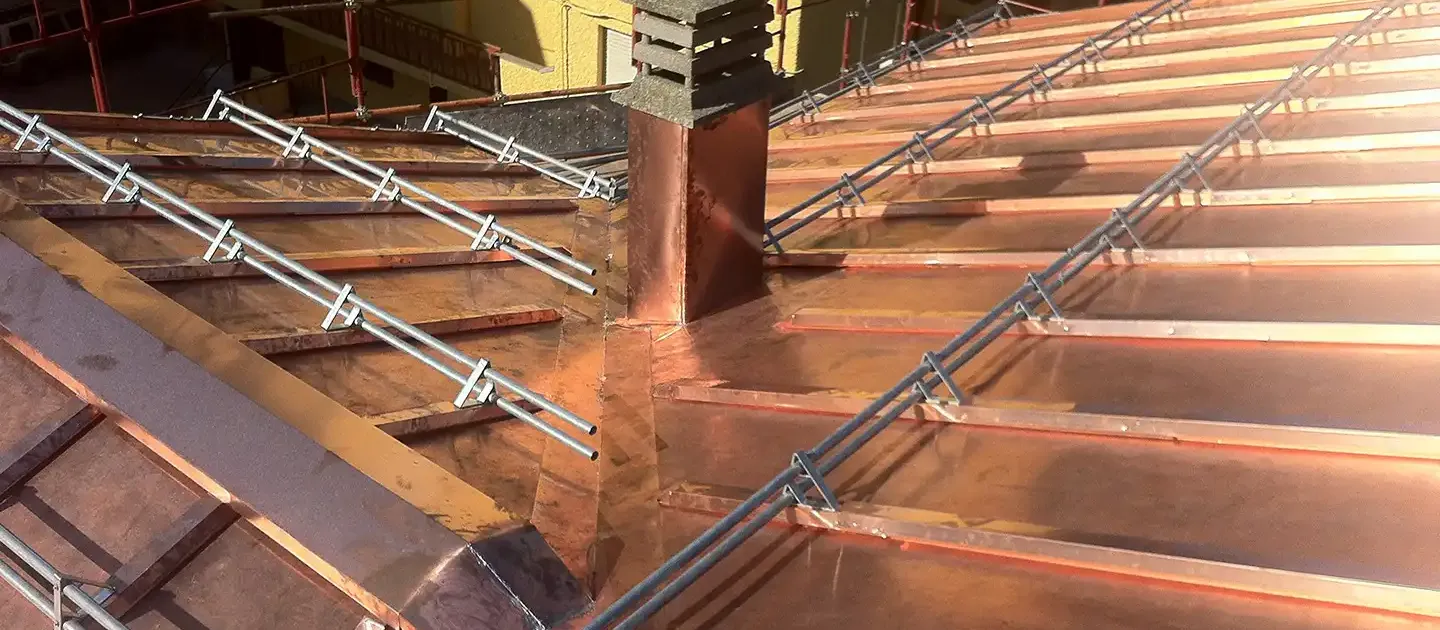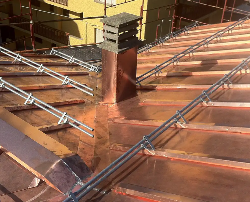 Il rifacimento delle coperture ha interessato due stabili, con l’obiettivo di migliorarne protezione e prestazioni nel tempo. La rimozione della precedente copertura in lamiera e la posa del nuovo manto in rame hanno incrementato l’efficienza energetica hanno migliorato la copertura.