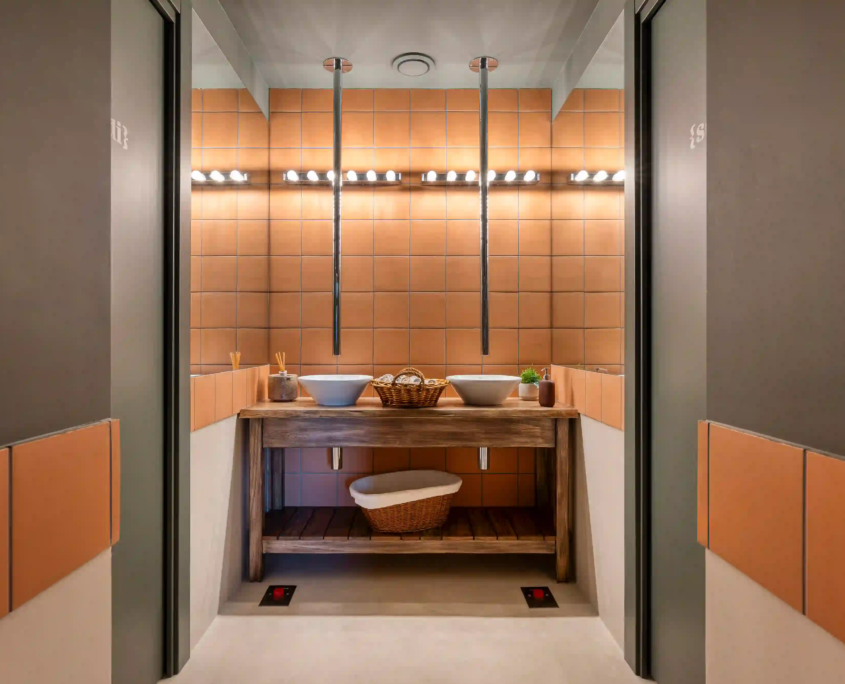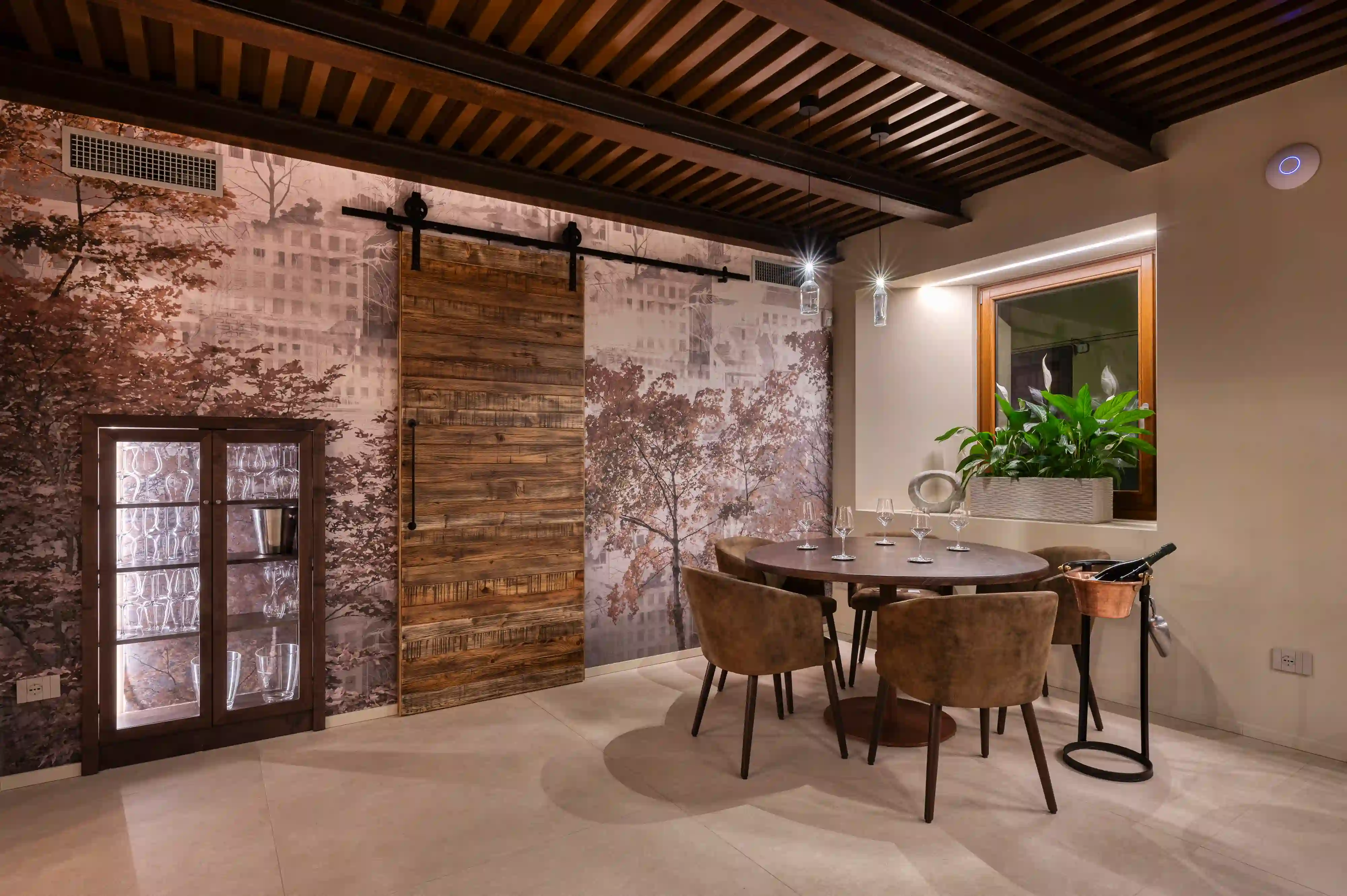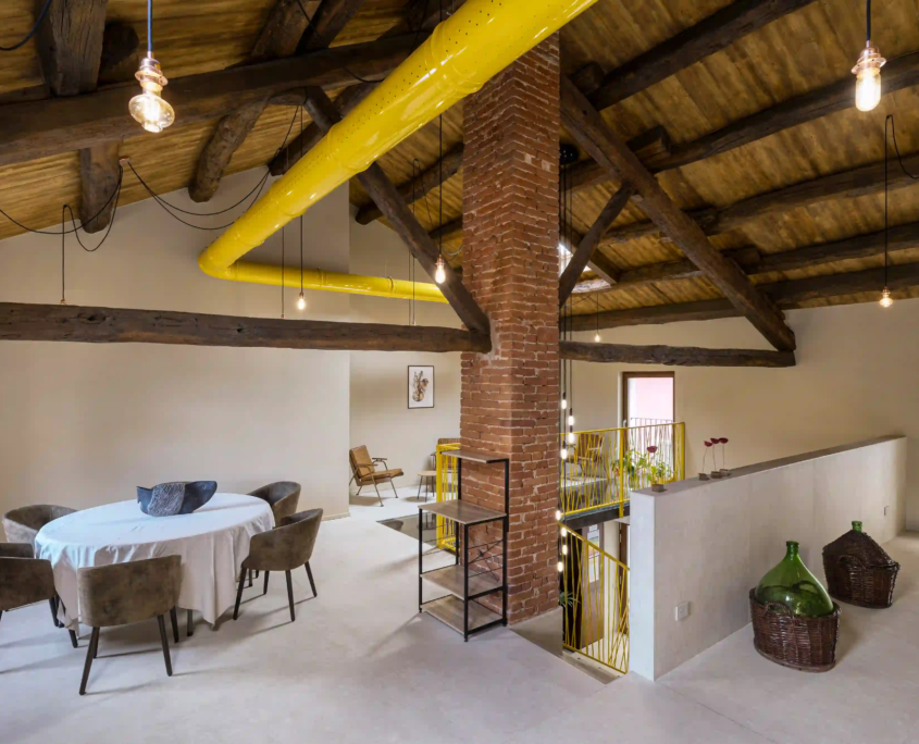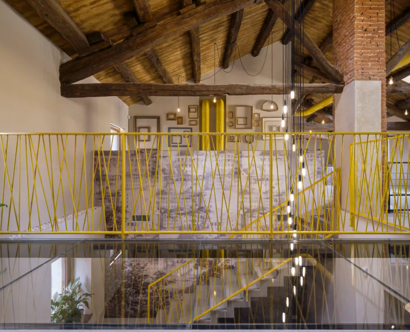 L’intervento ha incluso il completo rinnovo degli impianti, con nuovi sistemi elettrici, idrosanitari e termici. Le murature sono state rinforzate e isolate per garantire comfort, mentre dettagli come carta da parati, ringhiera gialla, canalizzazioni a vista e soletta vetrata definiscono un interno riconoscibile.
