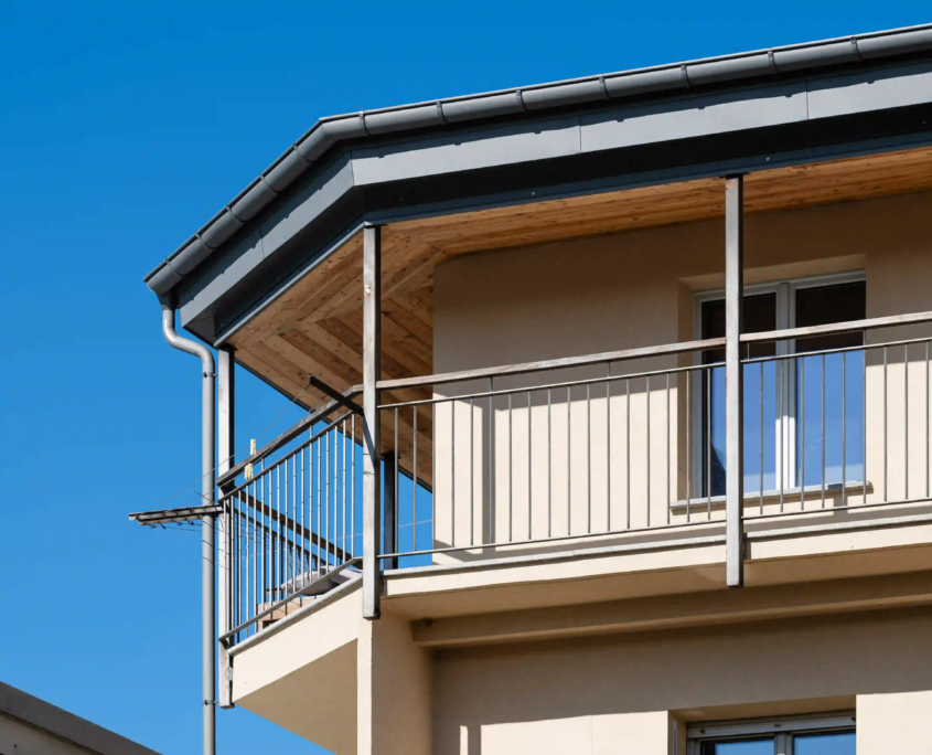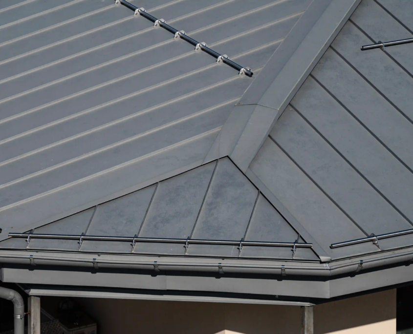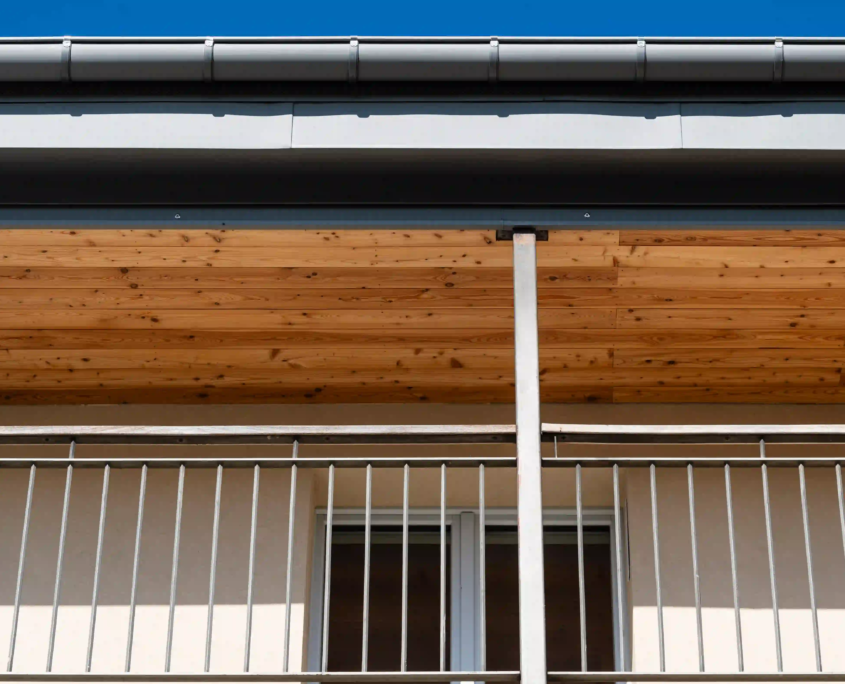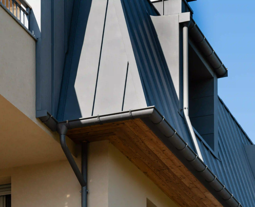 Il progetto si è concentrato sul rinnovo della copertura, realizzata con rivestimento Prefa a doppia aggraffatura, e sull’aggiornamento dei rivestimenti esterni in perline di legno del sotto cornicione e del vano scala. La riqualificazione energetica ha compreso cappotto esterno, isolamento della copertura e sostituzione dei serramenti.