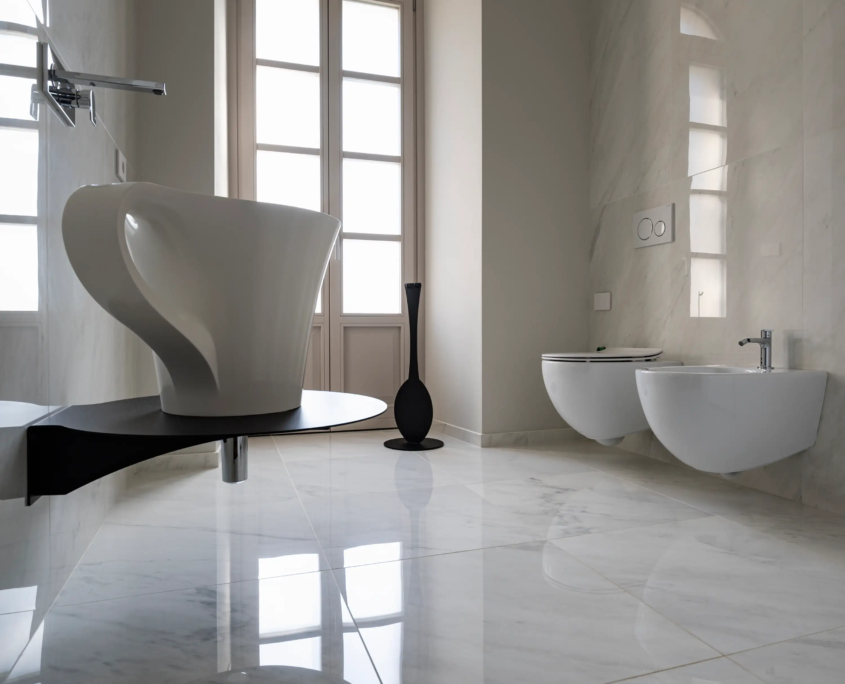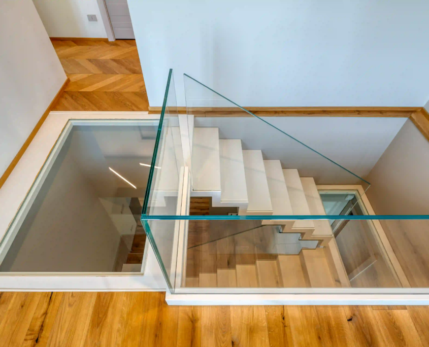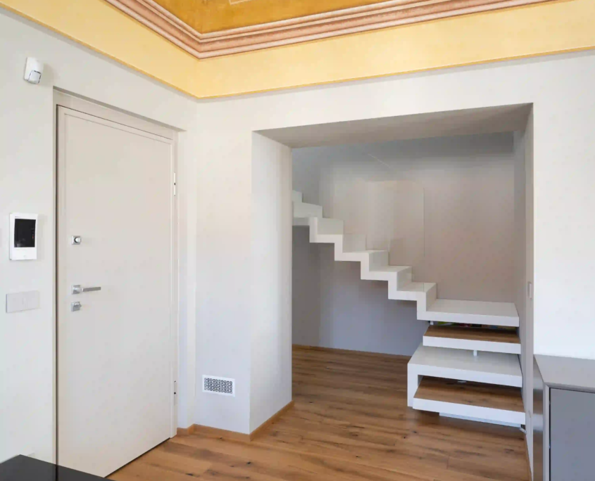 La nuova distribuzione interna si sviluppa su due livelli, con zona giorno al piano terra e zona notte al piano primo. Il restauro degli elementi di pregio, come il soffitto affrescato, si affianca all’isolamento delle facciate con cappotto lavorato a bugne e al ripristino delle cornici. L’accesso al terrazzino panoramico completa l’intervento.